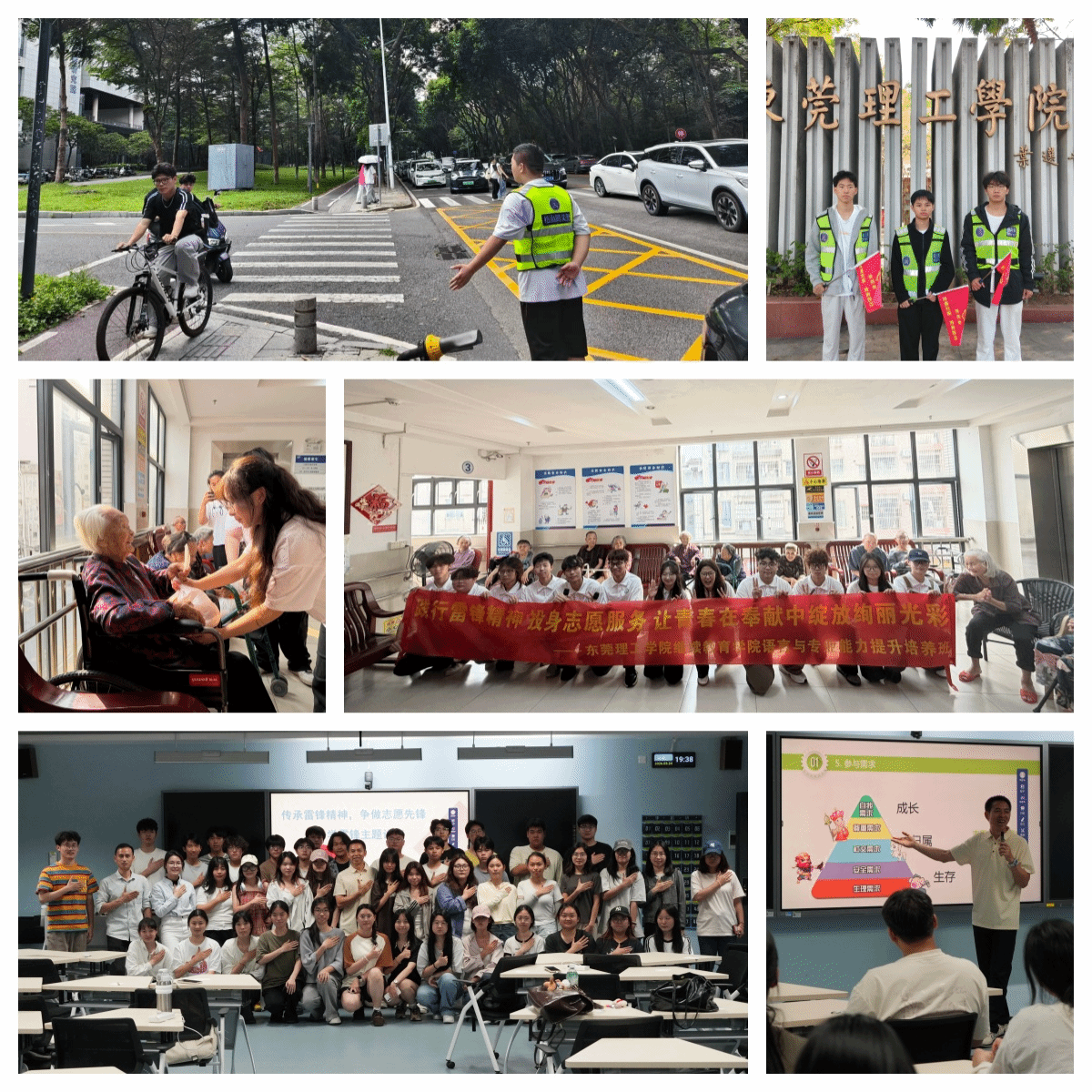 为深入贯彻校团委相关通知要求,紧扣第63个“学雷锋纪念日”与第27个“中国青年志愿者服务日”,近期我院助学班学生在松山湖和莞城两校区开展学雷锋系列主题活动。活动中,松山湖校区学生开展了交通引导志愿服务,在校园周边疏导车流、引导行人,维护交通秩序,学生志愿者们还走进敬老院,陪老人谈心、整理内务,传递温暖;莞城校区学生则聚焦主题班会开展相关活动。此外,结合两校区实际安排,专题讲座、主题班会及理论宣讲三...