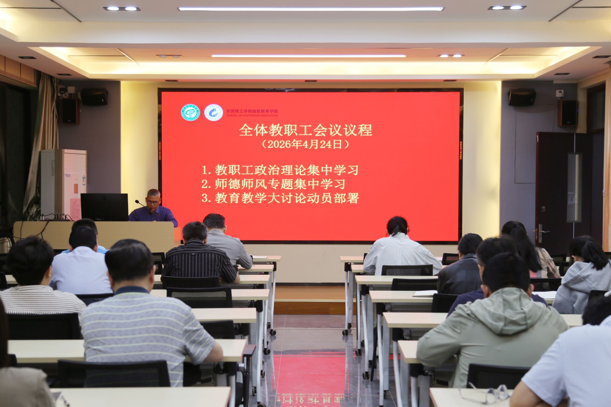 4月24日,继续教育学院在莞城校区7310召开教职工会议,会议由党总支书记潘荣新主持,全体教职工参加会议。